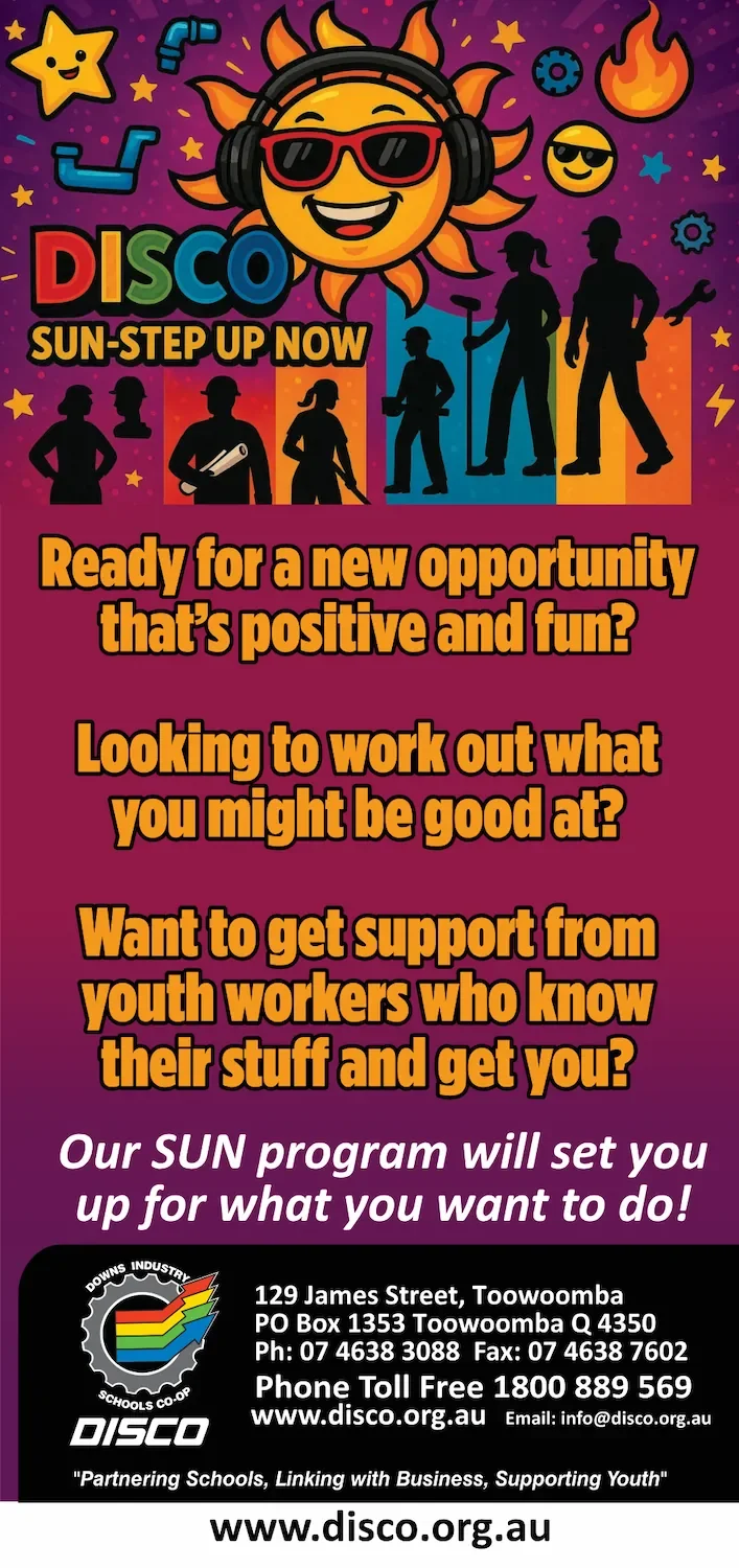 DISCO (Downs Industry Schools Co-op) is proud to announce the launch of its newest initiative – the Step Up Now (SUN) program – designed specifically to support 14- and 15-year-old young people who are disengaged or are at high risk of disengagement from traditional schooling and uncertain about their future.